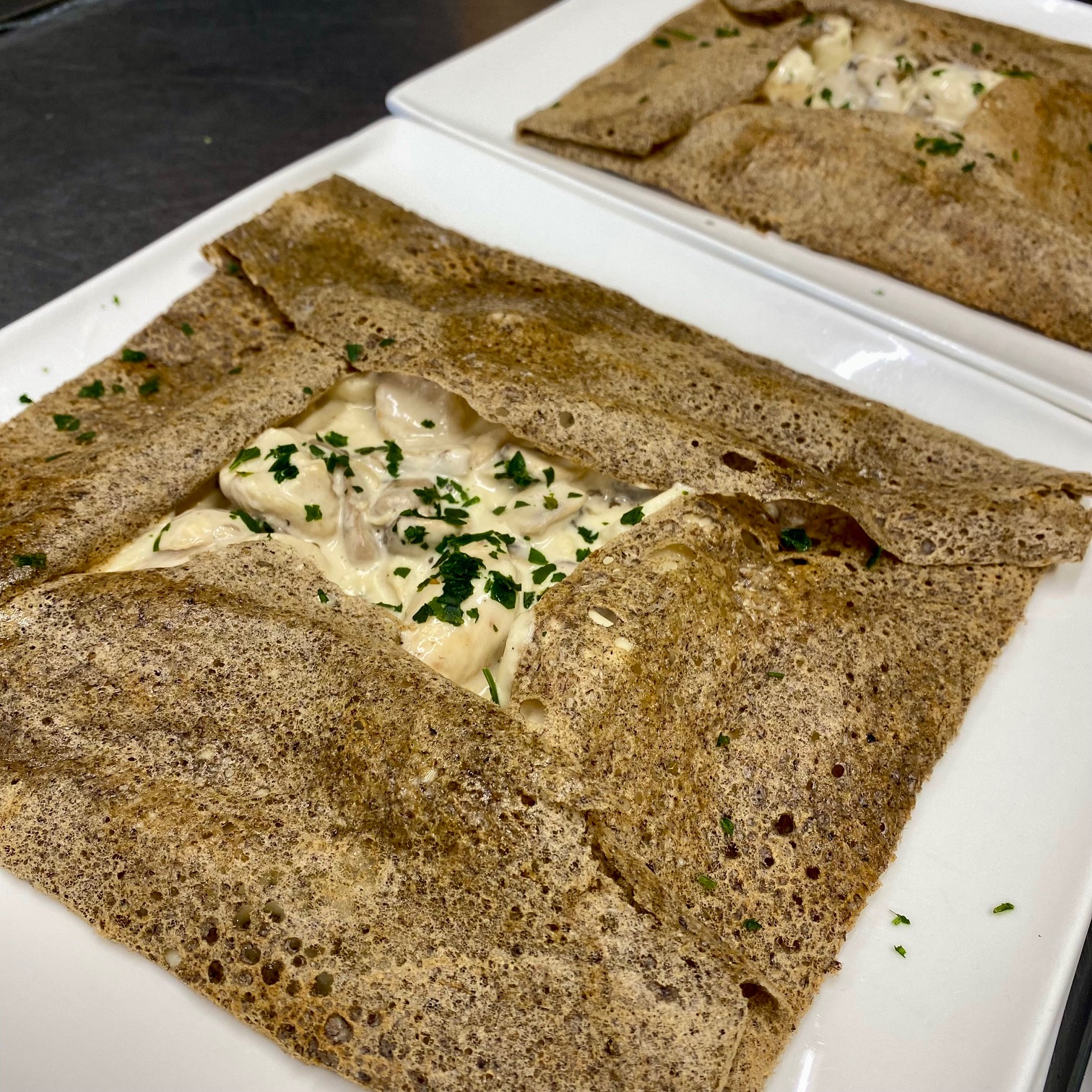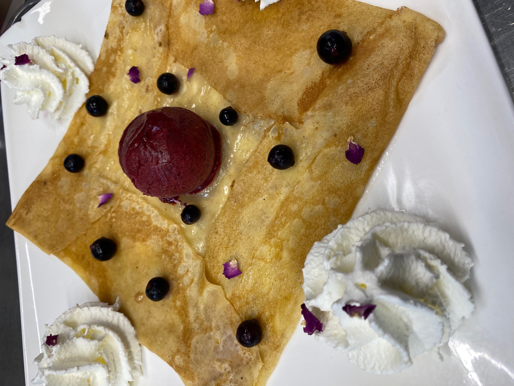 Nos galettes et crêpes du moment La galette du moment Façon vol au vent : fond d'emmental, champignons de Paris à la crème, poulet et quenelles, décor persil. La crêpe du moment Curd de citron maison, sorbet cassis noir de Bourgogne, chantilly, cassis égrené, pétales de roses séchés.