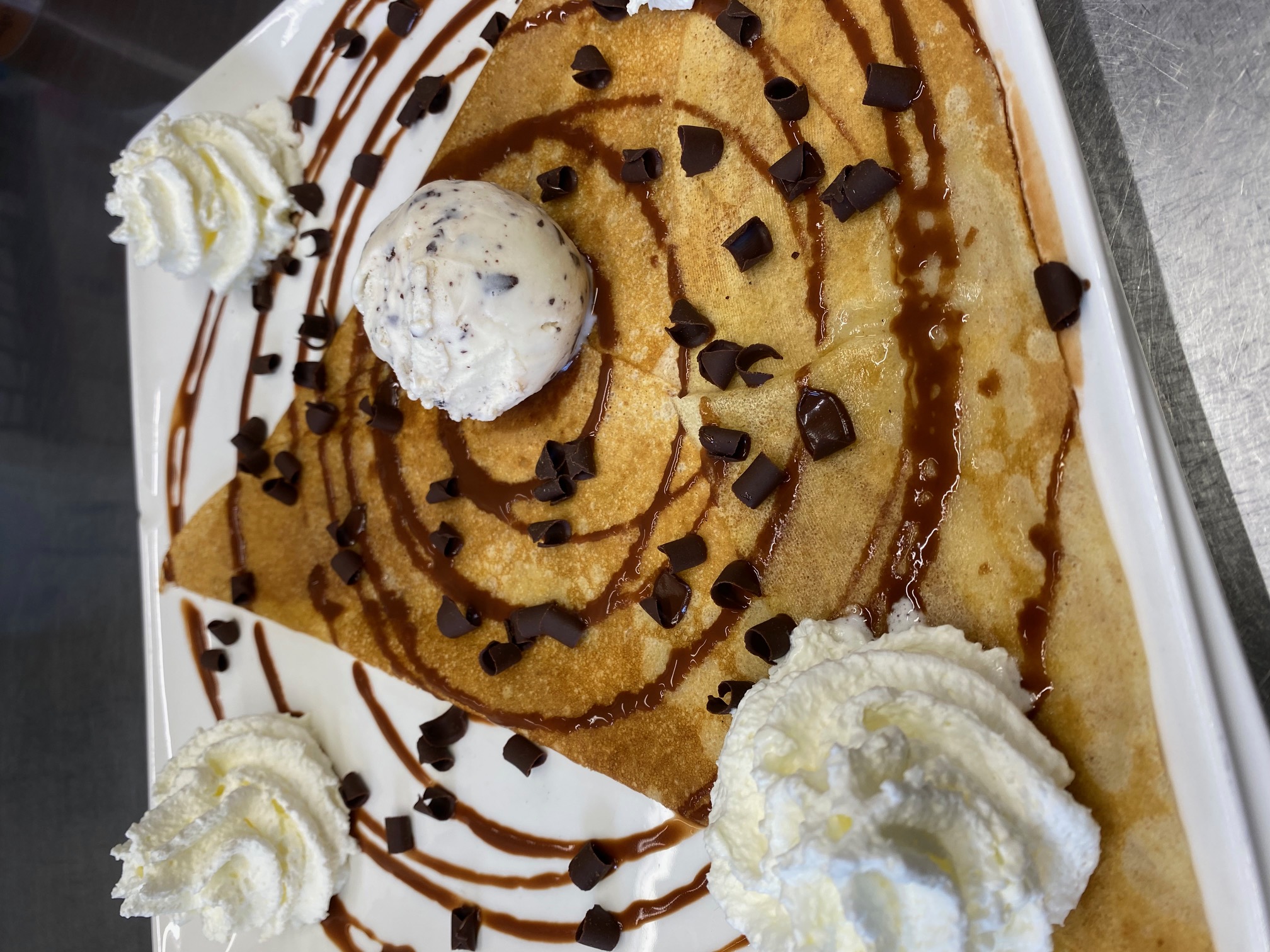 Coulis de chocolat au lait Weiss, copeaux de chocolat noir, glace Stracciatella, chantilly.