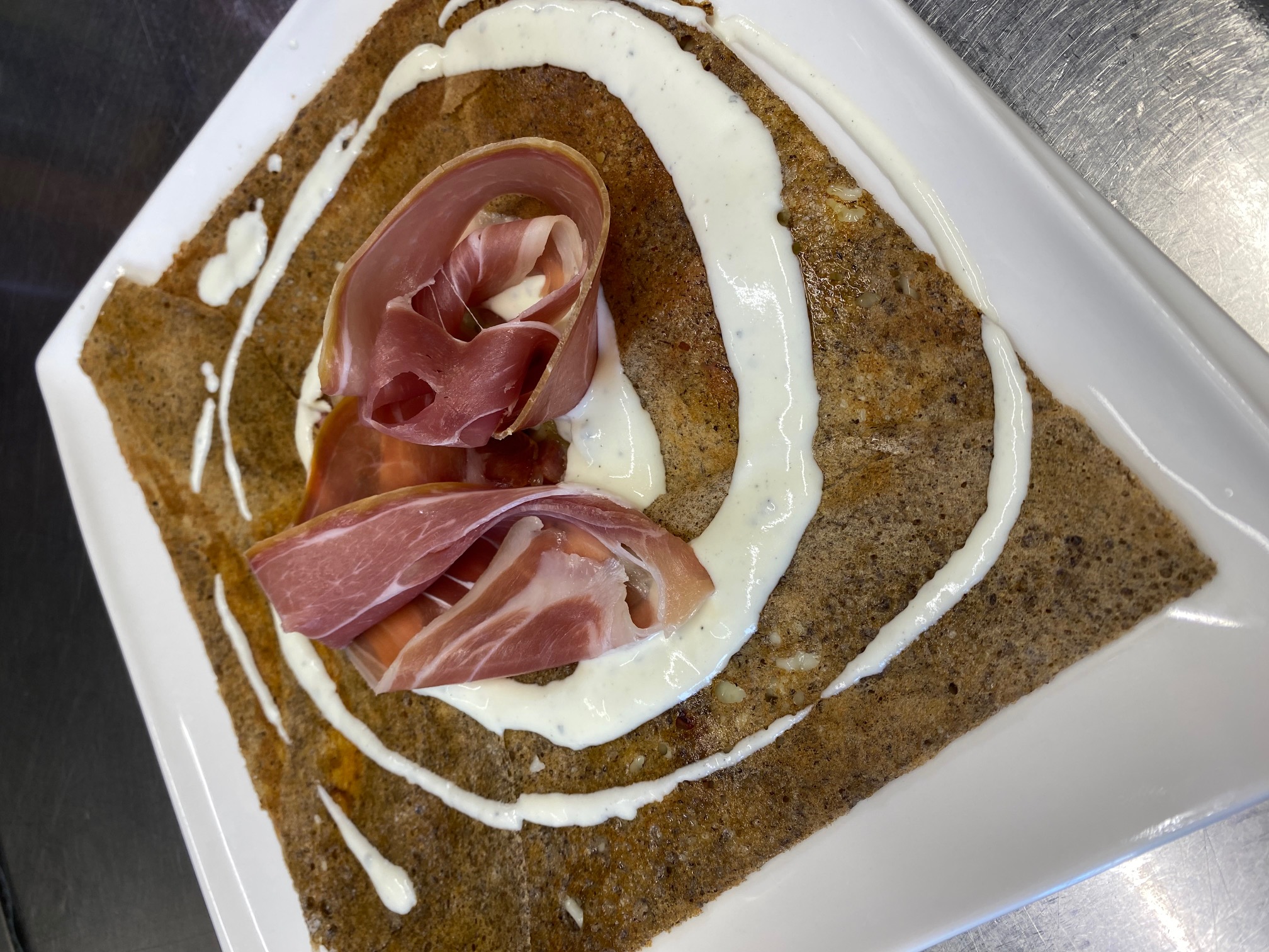 Emmental, oignions et lardons rissolés, jambon serrano, sauce roquefort, salade.